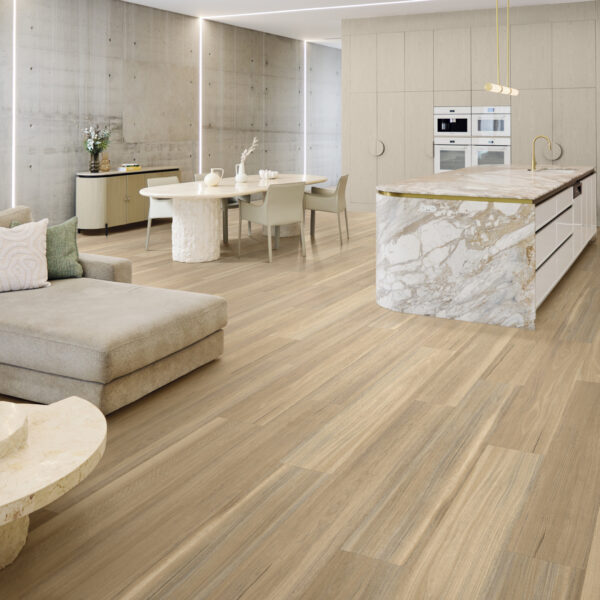 Celebrate the rich warmth and natural character of Australian blue gum with the strength of modern hybrid flooring. Natural Blue Gum features warm honey and soft reddish-brown tones with distinctive grain variation, creating an inviting timber look perfect for both contemporary and traditional interiors. Built with Karndean’s rigid K-Core™ construction, it’s 100% waterproof and highly dimensionally stable, making it ideal for kitchens, bathrooms, and open-plan living areas. The integrated acoustic backing helps reduce impact noise, while the 5G click-lock system makes installation quick, clean, and glue-free. Enjoy the authentic beauty of Australian hardwood with long-lasting durability, comfort underfoot, and easy maintenance.