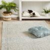 A treat to the eyes and to the foot, this luscious high pile finish rug from the Levi Brook rug collection is made from microfibre polyester, table tufted in India to withstand high traffic areas while maintaining its comfort and luxurious feel. Punctuated with a geometric and abstract linear patterns, earthly toned on blue green context bringing in a nomadic and rustic ambiance in every home or room setting.